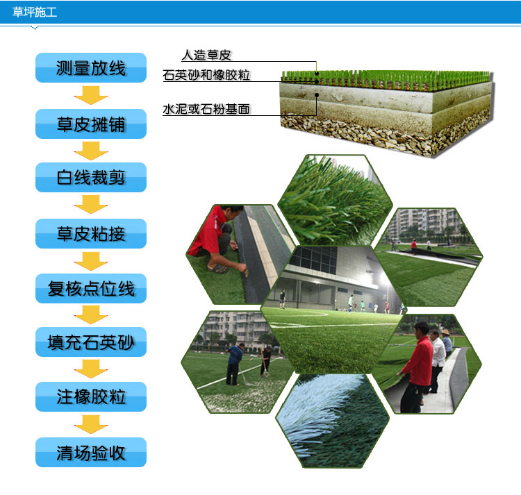 人工草坪均使用進口(PP)樹脂纖維和聚丙烯纖維精制而成,具有彈性好、抗老化、耐磨、不褪色、易鋪設(shè)、易保養(yǎng),排水快、易清洗等優(yōu)點;特別適用于大中專及中學(xué)的體育操場,體育俱樂部一些運動人次多、使用頻率高的運動場地。